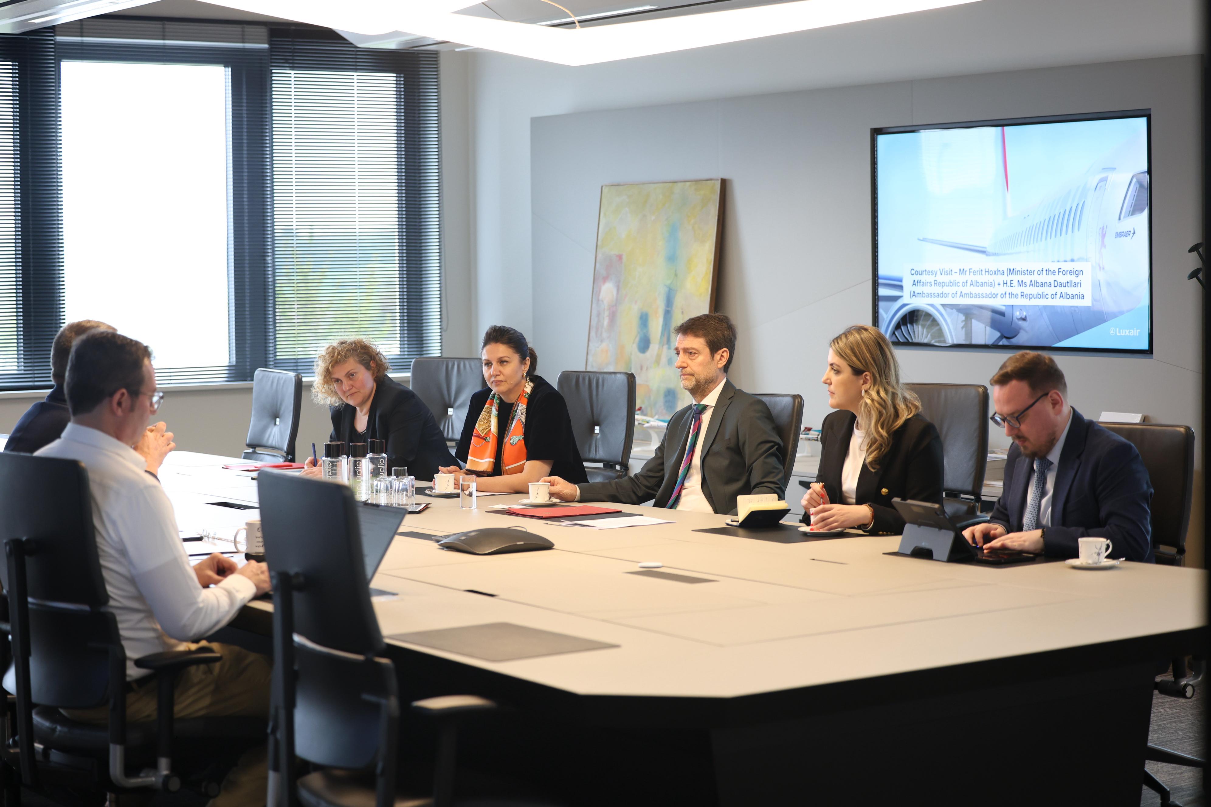 Ministri për Evropën dhe Punët e Jashtme, Ferit Hoxha, ka takuar ditën e sotme Drejtorin Ekzekutiv të Luxair, Gilles Feith, dhe ekipin e tij, për të shqyrtuar mundësitë e vendosjes së lidhjeve ajrore ndërmjet Shqipërisë dhe Luksemburgut.